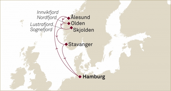 Reisen Sie von Hamburg aus in die atemberaubende Fjordregion Norwegens, wo Sie jede Sekunde der außergewöhnlichnen Landschaft sowohl an Deck als auch an Land genießen können, während Sie durch malerische, farbenfrohe Straßen schlendern.